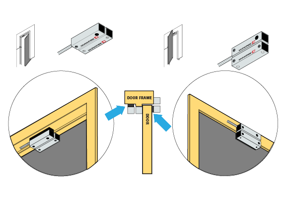 Out-Swinging Installations (Switch affixed to door stop. Magnet mounted to door using bottom-mount holes. Labels facing downward.)